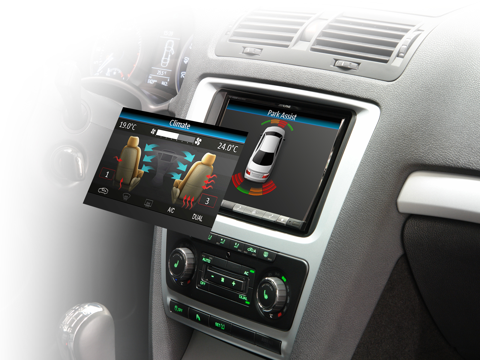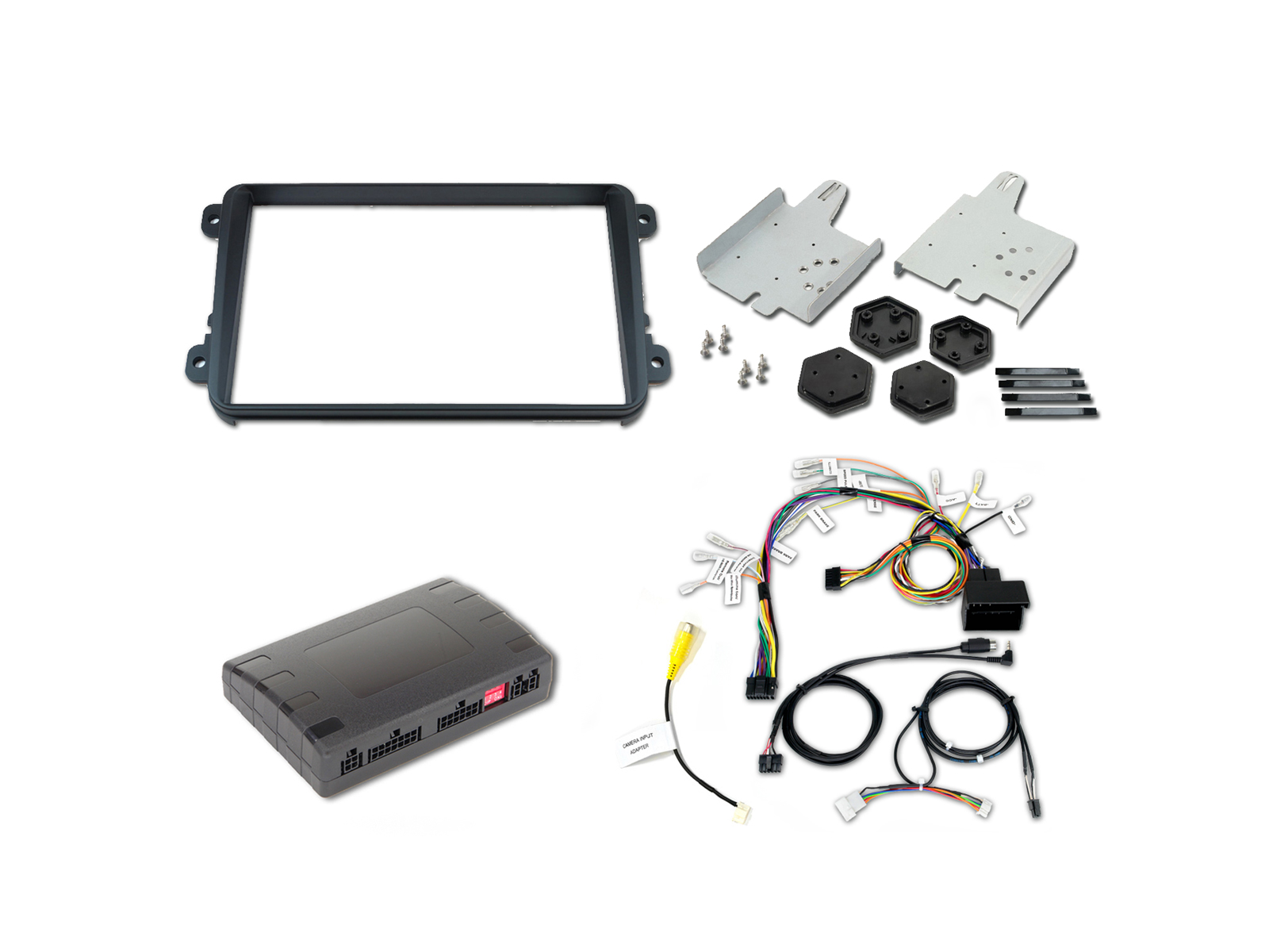 The series of 8 inch installation kits for the VW platforms include all parts needed to install and make INE-W928R work in the target vehicle. The parts for mechanical fitting are included as well as an interface that allow to retain the car’s air condition and heater control screens as well as the optical parking sensor representation. The interface will also support the car’s radio display in the instrument cluster (MFD) and Steering Wheel Remote Control.