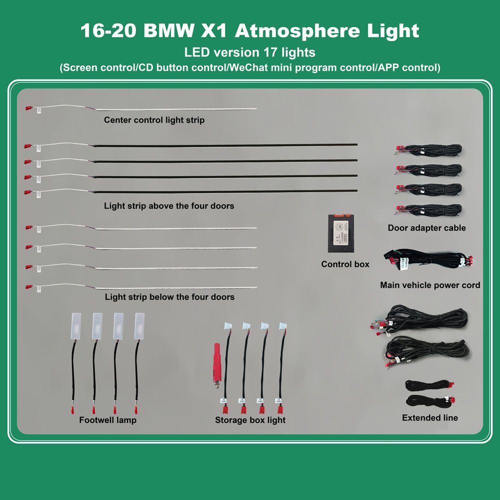 - Standard 17pcs lamps (4 door handle lights, 4 door outline lights, 4 door storage box lights, 4 footwell lights, 1 central light).