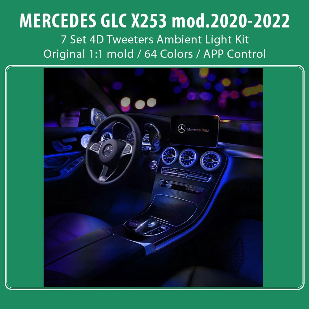 - 34 Light Sources (7 front and rear air vents, 2 backrest lights, 4 footwells, 4 center saddle lights, 4 door panel contours, 4 pull handles, 2 tweeters, 4 midrange cover lights)