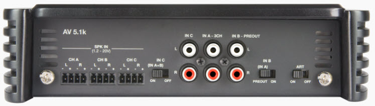 AV 5.1k, 1650 W (RMS) max, five-channels: with its hybrid design, it is the specialist amplifier for front + rear + subwoofer or multi-amplified front + subwoofer systems.