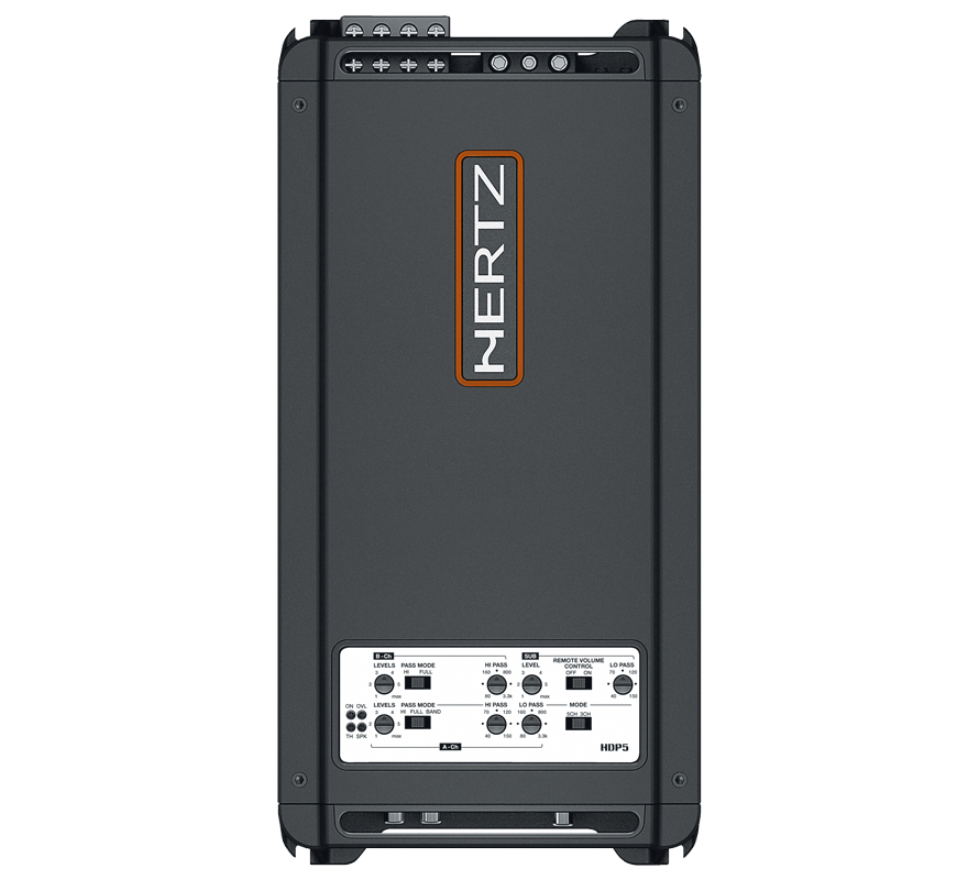 connections: HDP 5 features the HDP IN system which, through the Speaker In and RCA inputs, provides the ability to interface with any OEM and aftermarket source. The power stage features a double power supply to ensure energy flows steadily. The double-extrusion heat sink and the Hertz logo, which is back lit and can be rotated, allow especially sophisticated installations.Technologies