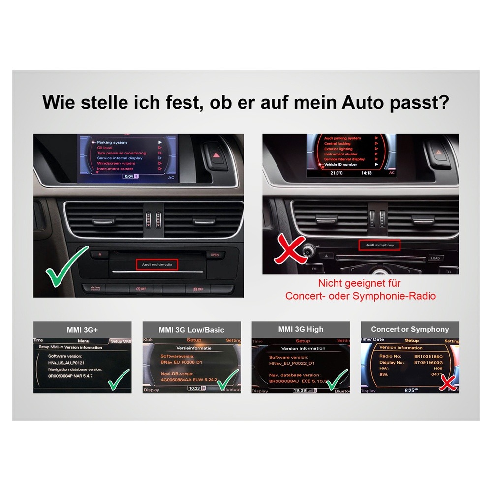 | 2008-2015 | Audi | Q5 | OEM radio: AUDI MMI 3G+/3G High system, 7" monitor, 4-pin LVDS connector. AUDI MMI 3G Basic/Low, 6.5" monitor, 4-pin LVDS connector. |