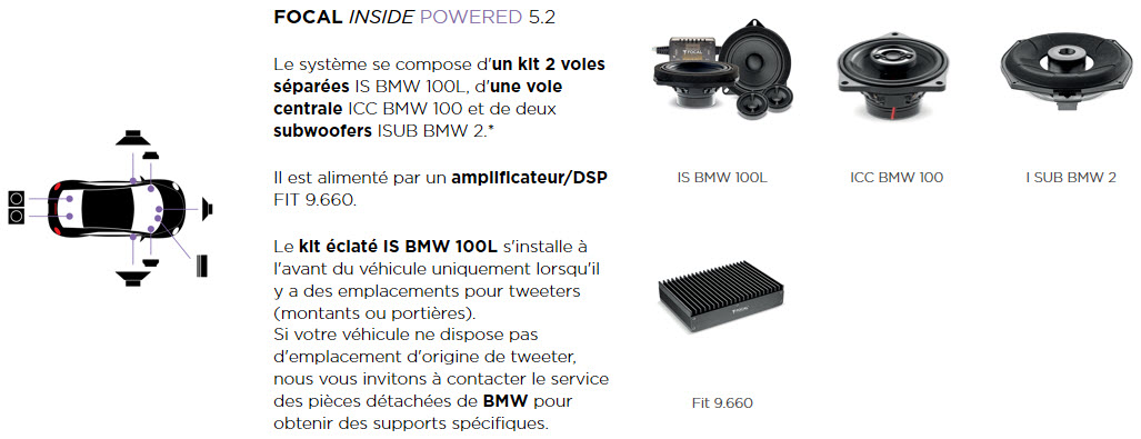 Ολοκληρωμένο Set Ηχείων Focal Inside Plus Powered 5.2 και ενισχυτή, ειδικά προσαρμοσμένο για αυτοκίνητα Bmw & Mini Cooper, με εγκατάσταση Plug And Play στον εμπρός χώρο του οχήματος.