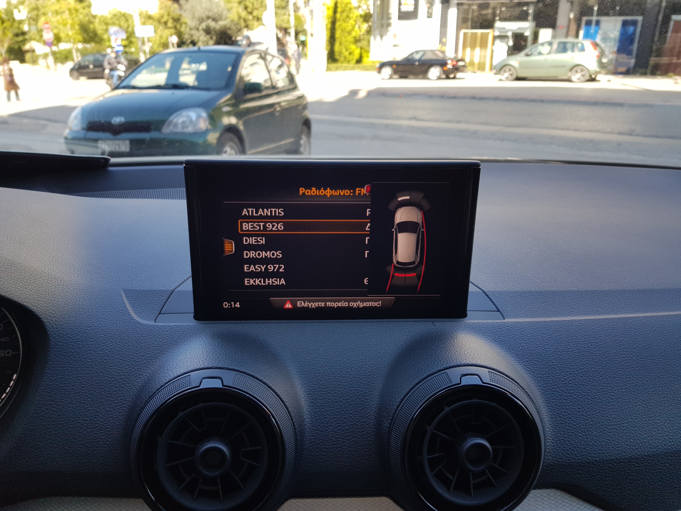 Εγκατάσταση εργοστασιακών Parking Sensor σε Audi Q2 GA. Εσωτερική Τοποθετήση, προσθήκη διακόπτη για τον ελεγχο των εμπρός αισθητήρων με απεικόνιση στην εργοστασιακή οθόνη.