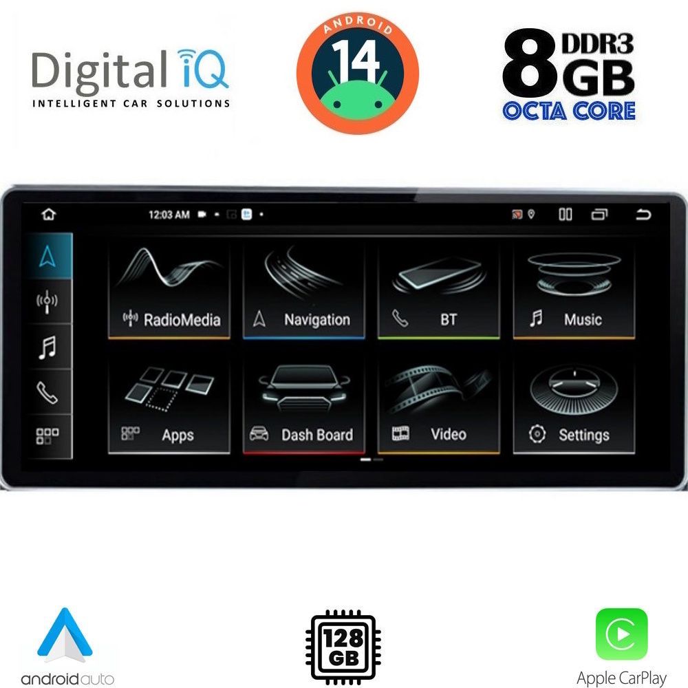 2x CORTEX-A75 & 6x CORTEX-A55" font_container="tag:h6|text_align:center" custom_heading_font_weight="600"][/vc_column][vc_column width="1/5"][vc_single_image source="external_link" external_img_size="170x170" alignment="center" css_animation="slideInDown" custom_src="https://digitaliq.gr/wp-content/uploads/2018/10/icon_memory_170x170.png"][vc_custom_heading text="RAM: 8GB LPDDR4x | NAND FLASH: 128GB" font_container="tag:h6|text_align:center" custom_heading_font_weight="600"][/vc_column][vc_column width="1/5"][vc_single_image source="external_link" external_img_size="170x170" alignment="center" css_animation="slideInDown" custom_src="https://digitaliq.gr/wp-content/uploads/2021/11/icon_android-170x170.png"][vc_custom_heading text="ANDROID 14" font_container="tag:h6|text_align:center" spacing_heading="" spacing_heading_tab="" spacing_heading_mobile="" custom_heading_font_weight="600"][/vc_column][vc_column width="1/5"][vc_single_image source="external_link" external_img_size="170x170" alignment="center" css_animation="slideInDown" custom_src="https://digitaliq.gr/wp-content/uploads/2022/01/icon_carplay_android-auto_170.png"][vc_custom_heading text="WIRELESS CAR PLAY & WIRELESS ANDROID AUTO" font_container="tag:h6|text_align:center" spacing_heading="" spacing_heading_tab="" spacing_heading_mobile="" custom_heading_font_weight="600"][/vc_column][vc_column width="1/5"][vc_single_image source="external_link" external_img_size="170x170" alignment="center" css_animation="slideInDown" custom_src="https://digitaliq.gr/wp-content/uploads/2018/10/rear_cam_icon.png"][vc_custom_heading text="SUPPORTS REAR CAMERA with REVERSE TRAJECTORY & PARKING SENSOR" font_container="tag:h6|text_align:center" custom_heading_font_weight="600"][/vc_column][/vc_row][vc_row][vc_column][vc_separator][/vc_column][/vc_row][vc_row][vc_column width="1/2" margin_right="40px" padding_right="40px"][vc_row_inner][vc_column_inner width="1/4" padding_top="20px"][vc_single_image source="external_link" external_img_size="100x61" alignment="center" css_animation="zoomIn" custom_src="https://digitaliq.gr/wp-content/uploads/2022/03/12_3inch-capacitive-touchscreen.jpg"][/vc_column_inner][vc_column_inner width="3/4"][vc_custom_heading text="TABLET 12.3 inches" font_container="tag:h5|text_align:left" custom_heading_font_weight="600"][vc_custom_heading text="Full HD Capacitive Touchscreen" font_container="tag:h6|text_align:left" custom_heading_font_weight="500"][vc_column_text]Eυκρινής οθόνη αφής, υψηλής ανάλυσης 1920x720pixels.[/vc_column_text][/vc_column_inner][/vc_row_inner][/vc_column][vc_column width="1/2"][vc_row_inner][vc_column_inner width="1/4" padding_top="20px"][vc_single_image source="external_link" external_img_size="100x100" alignment="center" css_animation="zoomIn" custom_src="https://digitaliq.gr/wp-content/uploads/2022/03/clima_100x100.jpg"][/vc_column_inner][vc_column_inner width="3/4"][vc_custom_heading text="CAR CLIMATE CONTROL" font_container="tag:h5|text_align:left" custom_heading_font_weight="600"][vc_column_text]Υποστηρίζει την προβολή του συστήματος κλιματισμού του αυτοκινήτου σας! (Aναλόγως την έκδοση)[/vc_column_text][/vc_column_inner][/vc_row_inner][/vc_column][/vc_row][vc_row][vc_column width="1/2"][vc_row_inner][vc_column_inner width="1/4" padding_top="20px"][vc_single_image source="external_link" external_img_size="100x100" alignment="center" css_animation="zoomIn" custom_src="https://digitaliq.gr/wp-content/uploads/2021/11/CarPlay-icon.jpg"][/vc_column_inner][vc_column_inner width="3/4"][vc_custom_heading text="WIRELESS APPLE CARPLAY" font_container="tag:h5|text_align:left" custom_heading_font_weight="600"][vc_column_text]