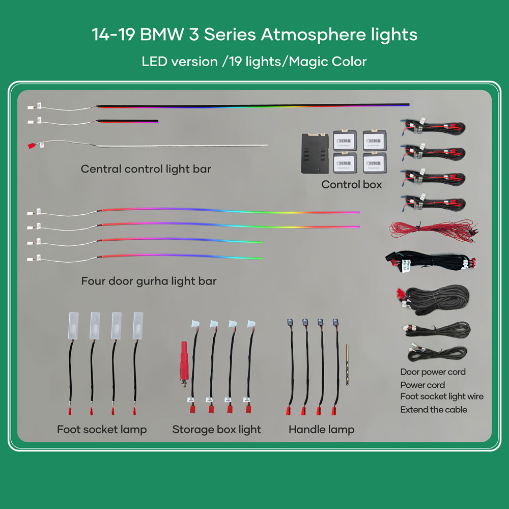 - 19 lights (4-door handle light, 4-door outline light bar, 4-door storage box light bar, 4 footwell lights, 1 central control co-driver through, 1 main driver, 1 central control CD player panel)