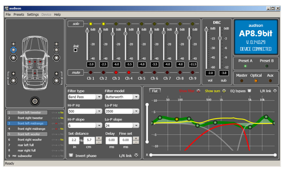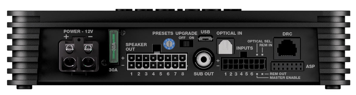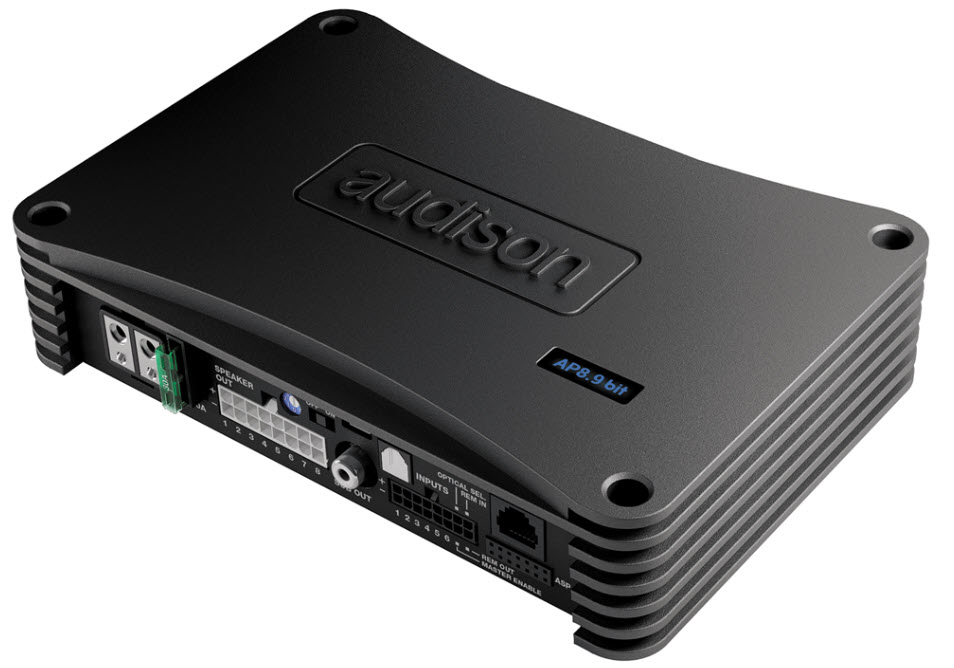 The AP8.9 bit amplifier was designed by Audison R&D Department to achieve maximum sound quality in OEM Integration applications. The powerful management software proves the ability to acquire the bit Drive presets which the Audison team fine-tuned specifically for your car. Thanks to the innovative power supply stage, a power of 520 W total can be achieved in an extremely compact case. The non-amplifiable ninth channel can be used to drive a subwoofer via the mono AP1 D amplifier.