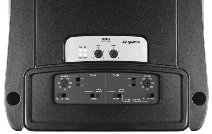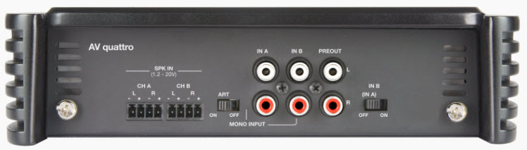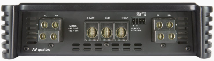 AV quattro is a four-channel amplifier which can work in four, three, two channel mode, delivering 1700 W (RMS) power total.