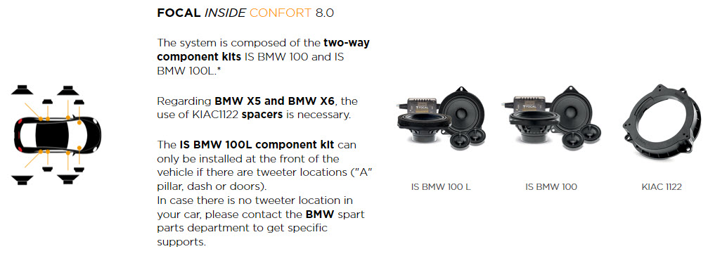 Ολοκληρωμένο Set Ηχείων της Focal Inside Confort 8.0, ειδικά προσαρμοσμένο για αυτοκίνητα Bmw & Mini Cooper, με εγκατάσταση Plug And Play στον εμπρός και πίσω χώρο του οχήματος.