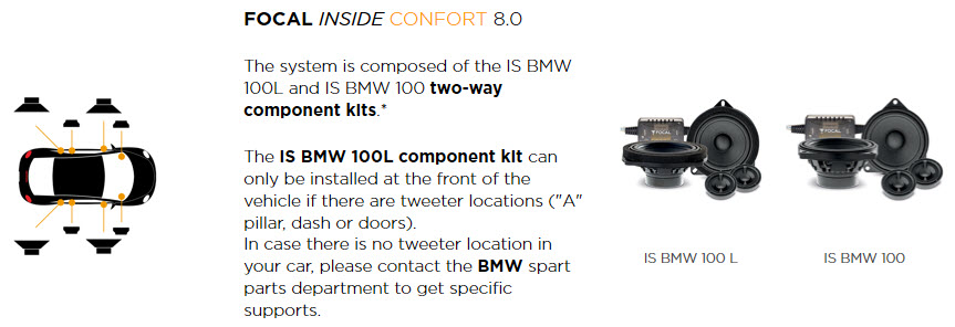 The IS BMW 100L component kit can only be installed at the front of the vehicle if there are tweeter locations ("A" pillar, dash or doors).
