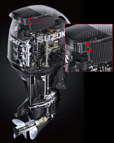 | FEATURE.01 12.0:1 COMPRESSION RATIO Our solution to developing 80 horsepower per liter in a V6 350 horsepower engine was to increase the compression ratio to 12.0:1, the highest compression ratio ever for a production outboard engine. In order to make this work without knocking (a typical problem at this ratio), we developed systems to mix cooler air with well-atomized fuel to provide optimal conditions for complete, and controlled combustion. |