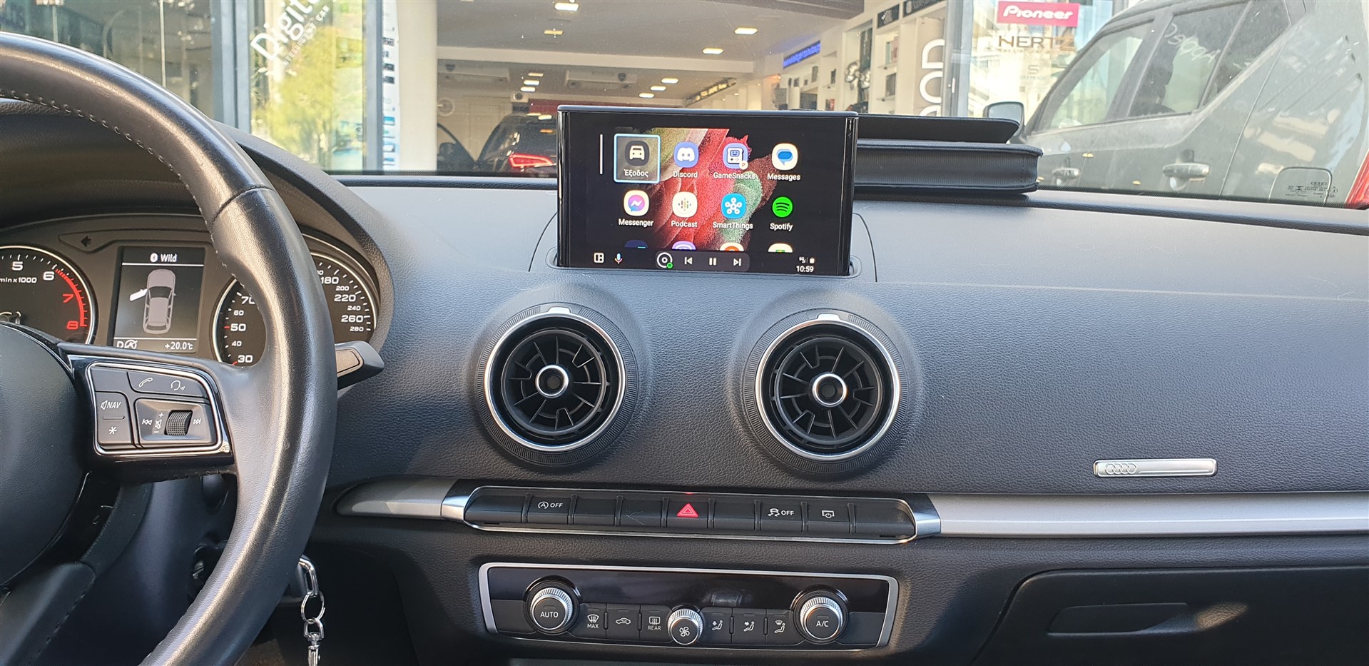 Αναβάθμιση της εργοστασιακής οθόνης σε A3 8V με Apple Car Play, Android Auto και κάμερα οπισθοπορείας. Ο χειρισμός των εφαρμογών ειναι μέσω του εργοστασιακού MMi και για συσκευές ios & Android μέσω Wireless. H εγκατάσταση είναι plug and play και απαιτείται εργασία μιας ωρας. O ηχος αναπαραγεται μέσω Audio Streaming η μέσω του εργοστασιακού Ami (Aux-in)
