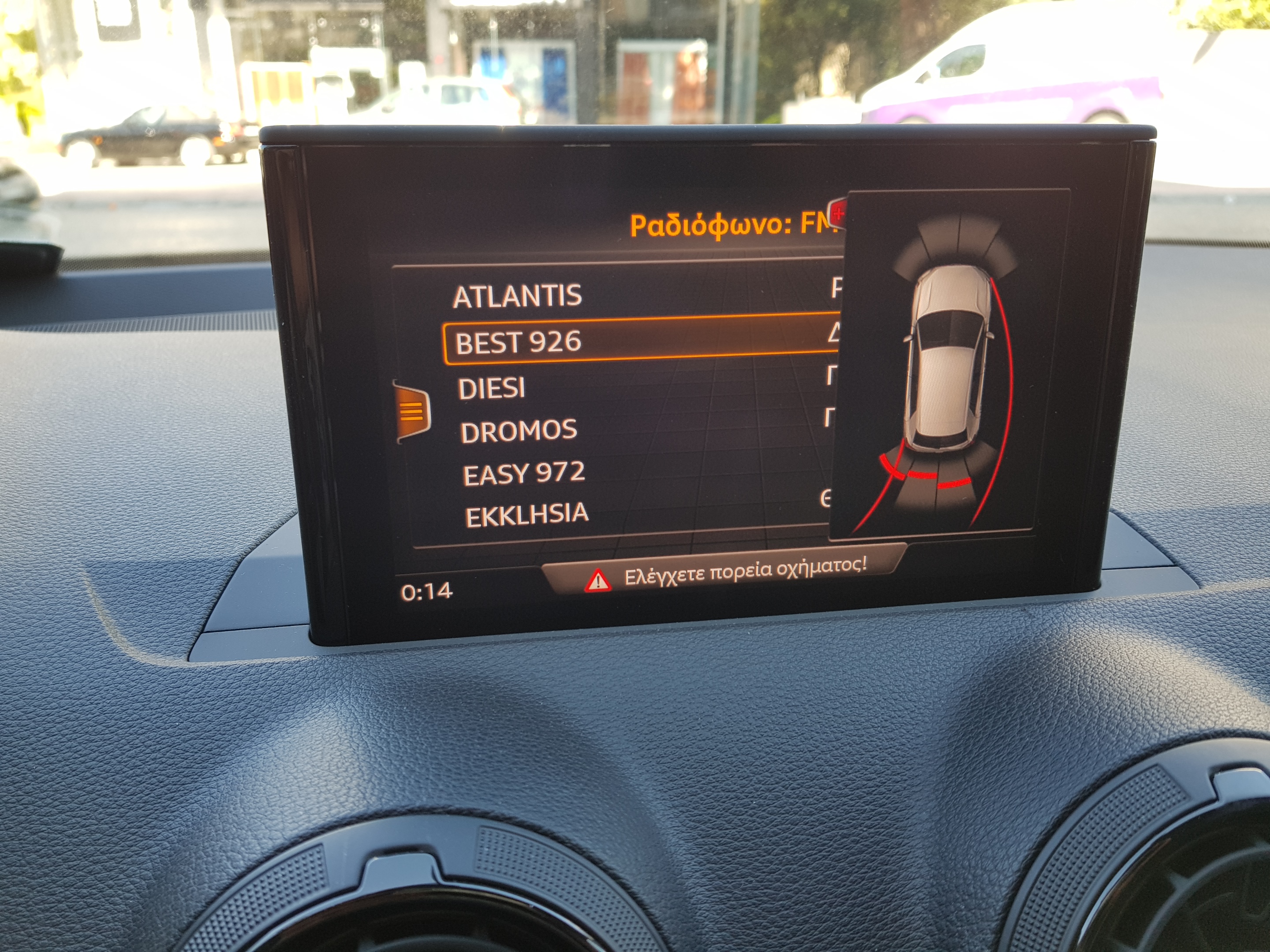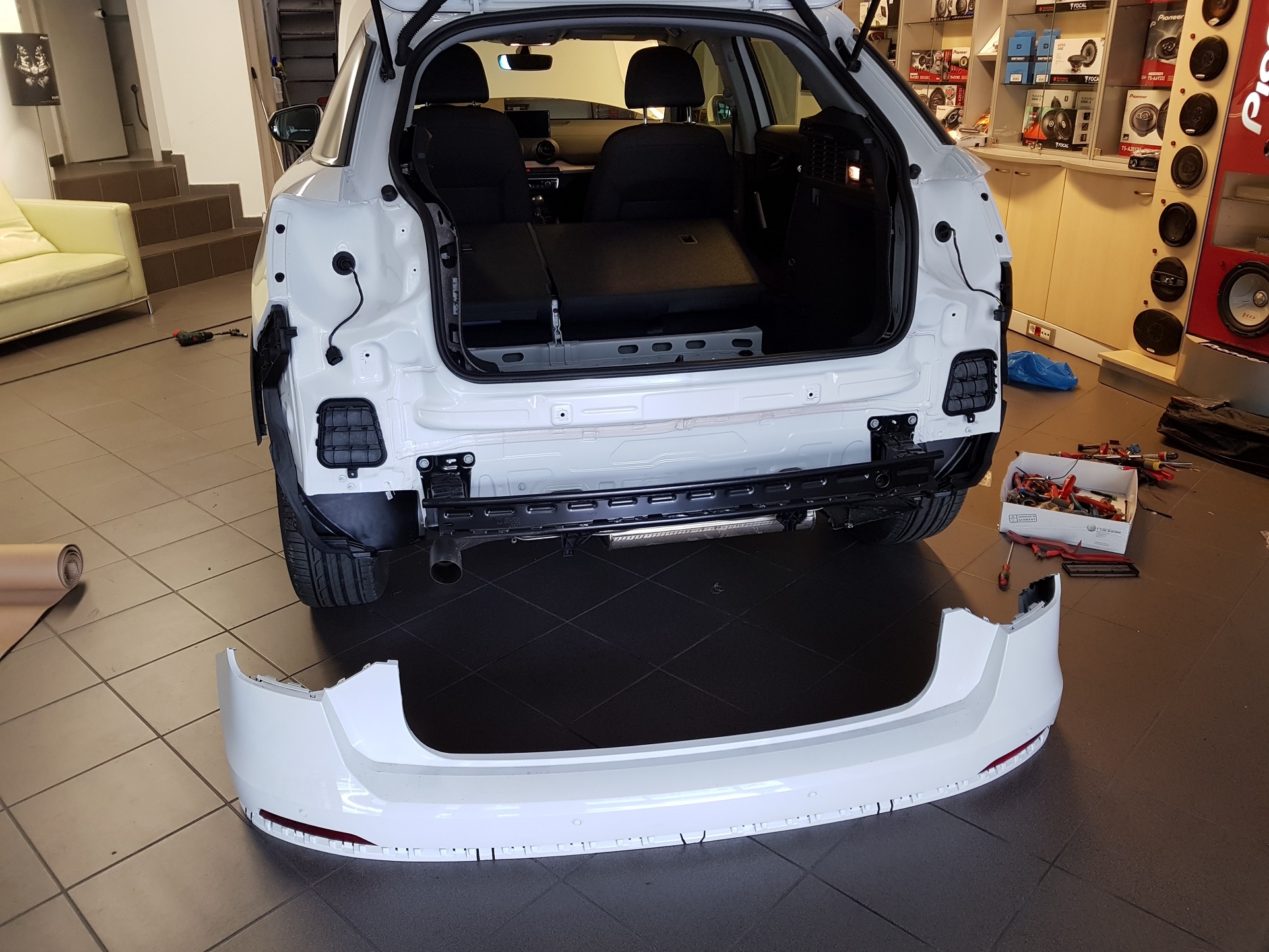 Εγκατάσταση εργοστασιακών Parking Sensor σε Audi Q2 GA. Εσωτερική Τοποθετήση, προσθήκη διακόπτη για τον ελεγχο των εμπρός αισθητήρων με απεικόνιση στην εργοστασιακή οθόνη.