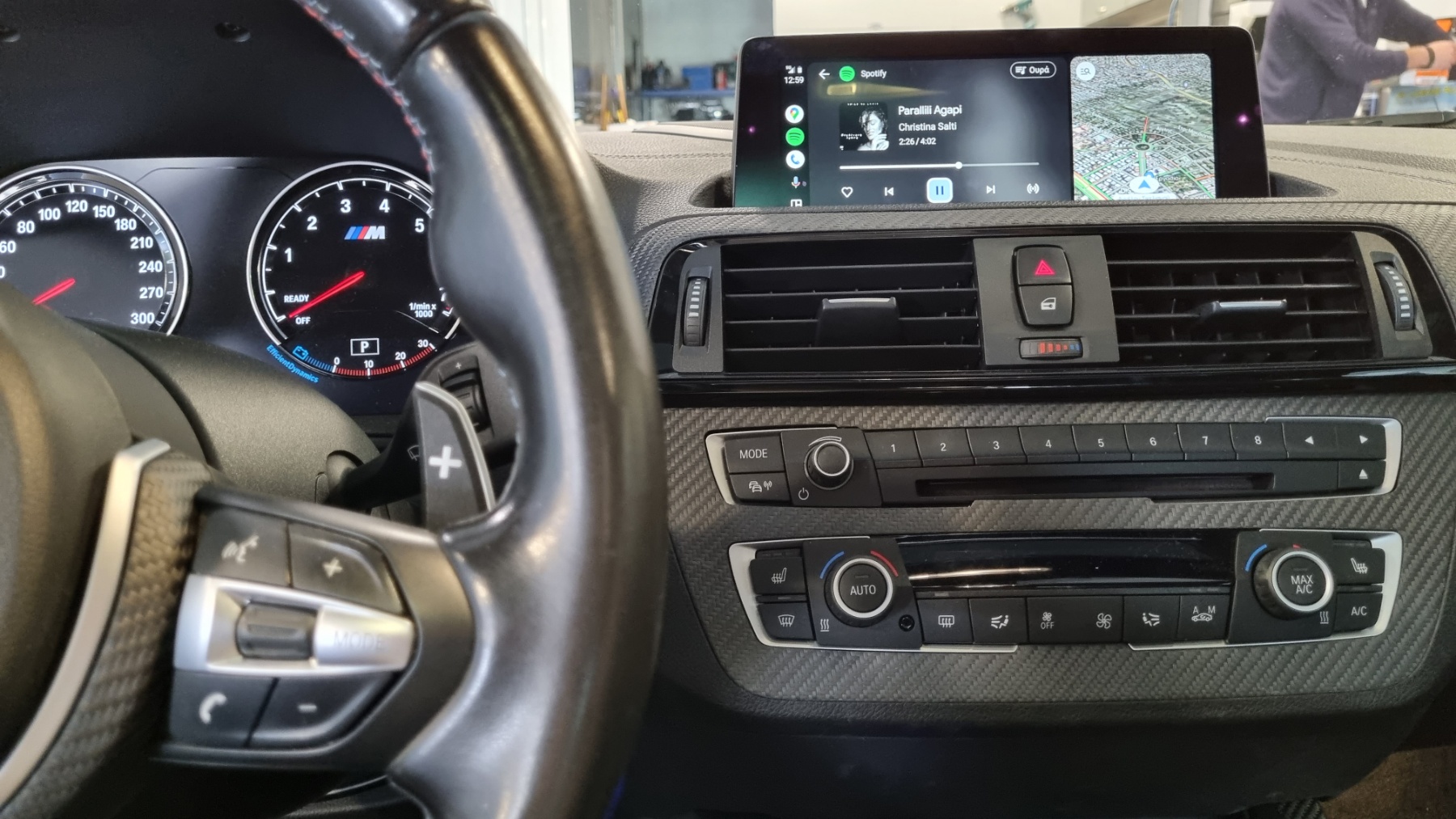 BMW M2 F-87. Wireless Apple Car Play, Android Auto κάμερα οπισθοπορείας και Media Player. Ο χειρισμός των εφαρμογών ειναι μέσω του I-Drive. Ο ηχος αναπαράγεται μέσω του Aux-In της εργοστασιακής πηγής και ο χρόνος που απαιτείται για την εγκατάσταση ειναι 1 ωρα.