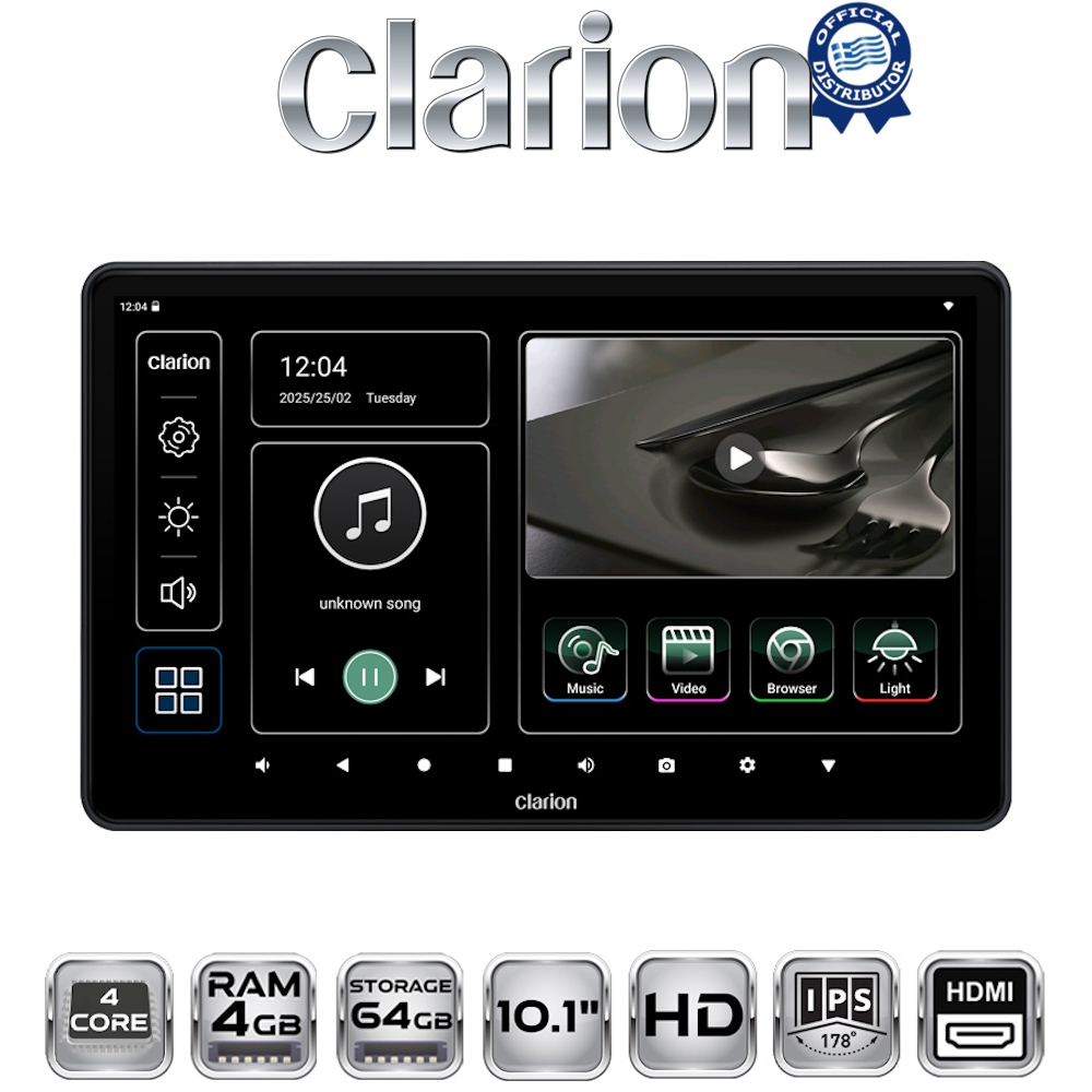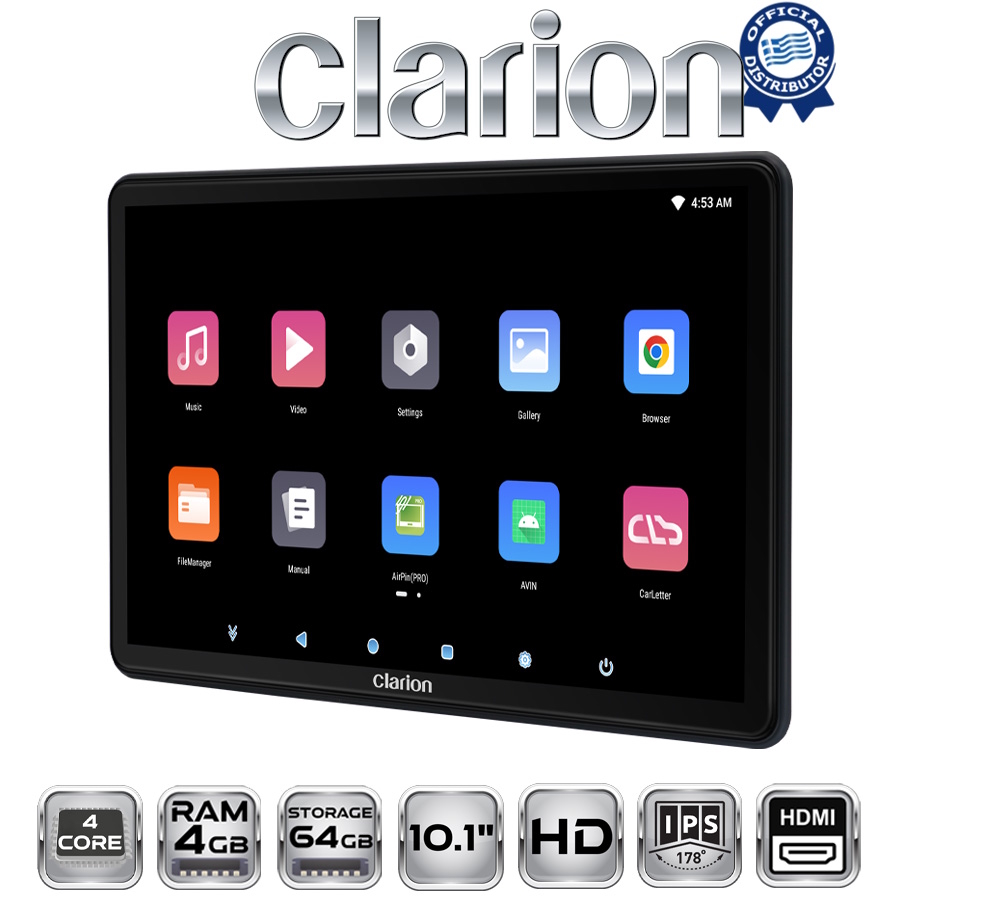 CLARION 10.1in HEADREST MONITOR 4c 4+64G - HDMI input/ output FM Modulator / BT / WiFi / USB / SD Card Slot